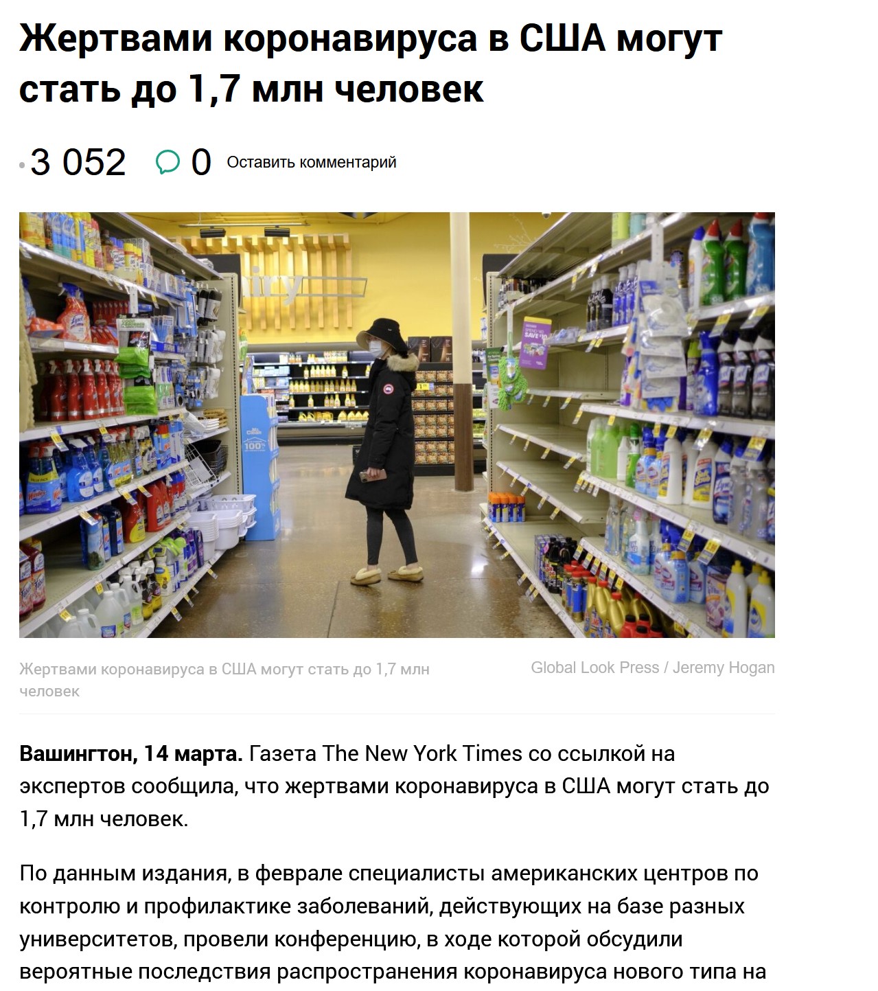 Теперь, объясните мне, какой вирус гриппа вызывает такую невозможную катастрофу? Какие-то люди сейчас в интернете хвастаются, что ничего не бояться. Другие идиоты протестуют и возмущаются против того, что их рутинная жизнь оказалась внезапно нарушена, что отменились поездки и развлекательные мероприятия. Эти люди не понимают, что начинается эпидемиологическая катастрофа.