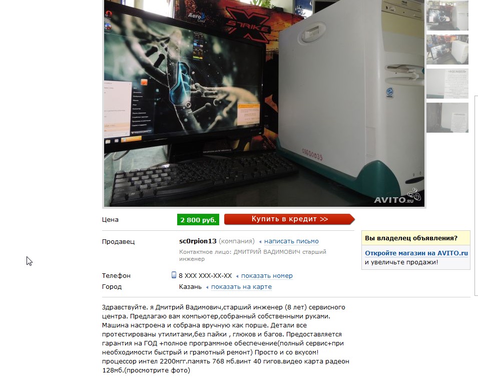 Здравствуйте. я Дмитрий Вадимович,старший инженер (8 лет) сервисного центра. Предлагаю вам компьютер,собранный собственными руками. Машина настроена и собрана вручную как порше. Детали все протестированы утилитами,без пайки , глюков и багов. Предоставляется гарантия на ГОД +полное программное обеспечение(полный сервис+при необходимости быстрый и грамотный ремонт) Просто и со вкусом! процессор амд 2500+ .память 1024 мб.винт 50 гигов.видео карта ге форс 128мб.(просмотрите фото)
