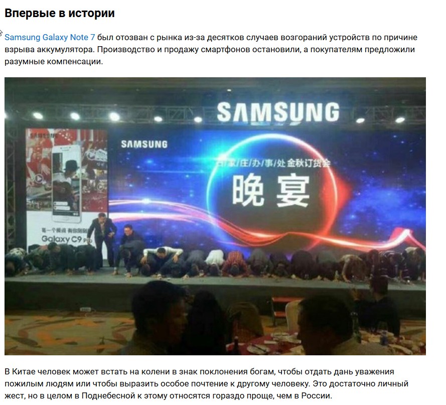 На мероприятии, прошедшем в китайском городе Шицзячжуан, 23 топ-менеджера компании Samsung на сцене опустились на колени перед инвесторами и покупателями. Так они извинились за ситуацию с отзывом Samsung Galaxy Note 7 и пообещали, что впредь такое не повторится, сообщает Techmundo. :desk: :desk: :desk: