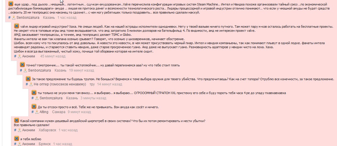 Все эти гадости пишет ачинский алень. Пора аленя кастрировать. Ачинская интелгомодрянь. Интел параша такая же как ее г-но фанаты. Только защекисты берут интел.
