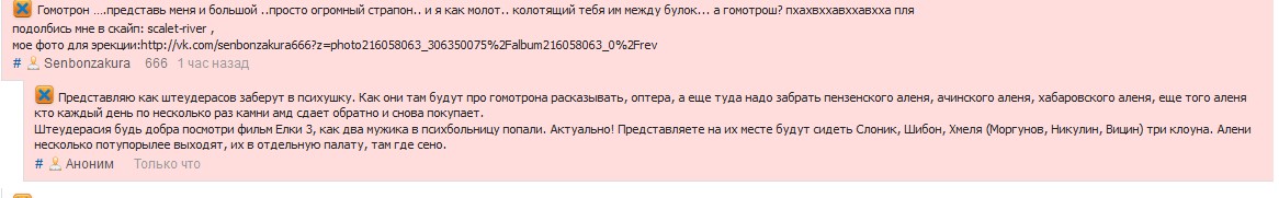Гомотрон, я вот хочу узнать, кого ты больше любишь. Представь вот ситуацию. Стоим возле тебя мы - Шибон, Хмеля, Ачинский Алень и Пензенский Алень. Тебе надо одного из нас забить до смерти монтировкой, одного помиловать и отпустить, остальных просто избить. Кто бы это был, а гомотроша?