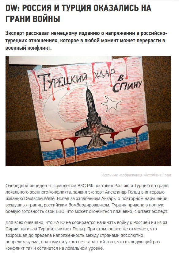 «А даже если не вмешается? Одними ракетными залпами никто еще войн не выигрывал. У турок сильная авиация и неплохая ПВО, относительно сильный флот. Общей границы у нас с Турцией нет, только по морю... Зато с Украиной у нас граница имеется. И в Донбассе обстановка стабильно накаляется все последние дни. Именно тут, вероятно, и произойдут первые решительные сухопутные сражения новой войны, в которой Украина явно выступит в качестве турецкого союзника. И крымские перешейки не останутся без внимания, и Приднестровье... «Допримирялись» наши «миротворцы» «сурковского розлива» до того, что России придется сражаться на два фронта», – отмечает он.