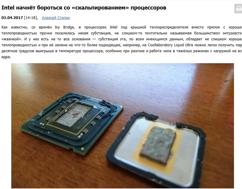Неудивительно, что практика «скальпирования» получила достаточно широкое распространение среди не самых пугливых энтузиастов, хотя среди увлечённых оверклокеров таких, пожалуй, и не сыскать. Но сам процесс «скальпирования» требует осторожности и твёрдых рук, поскольку повредить или полностью привести в неработоспособное состояние процессор в ходе этой процедуры достаточно легко (см. фото выше). Естественно, при этом теряется заводская гарантия, но, похоже, и это перестало устраивать Intel — компания намерена начать борьбу с «охотниками за скальпами», к счастью, пока чисто техническим путём.
