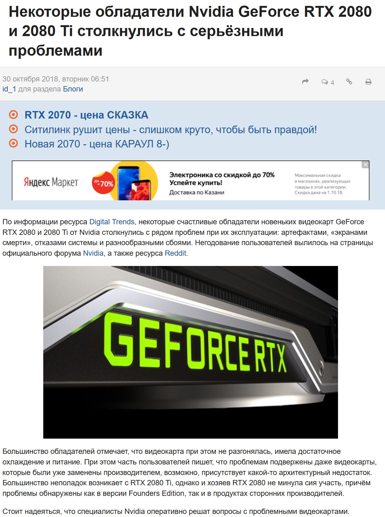 Добавлено спустя 24 минуты 43 секунды:Спустя некоторое время видеокарта начинает умирать. В большей степени ненадёжными оказалась GeForce RTX 2080 Ti в исполнении Founders Edition. RTX 2080 Founders Edition подвержены проблеме в меньшей степени, как и видеокарты в исполнении AIB-партнёров, но их это тоже касается. Спустя время наблюдаются артефакты, вертикальные полосы на экране, или картинка отсутствует вовсе.