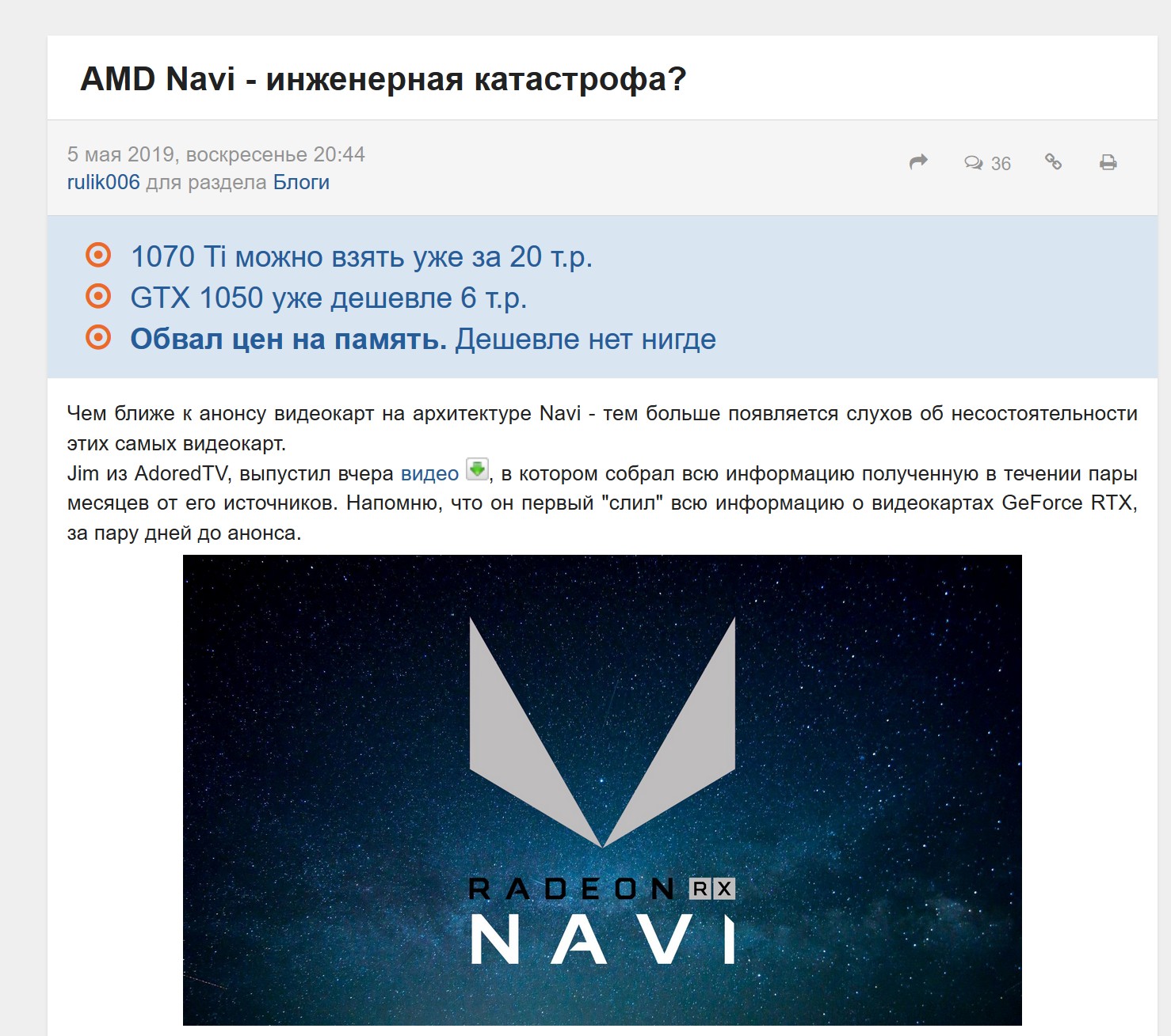 Также Jim получил сообщение от своих источников, в котором говорилось: «Не обращайте внимания оптимистичные прогнозы и веру в новые видеокарты. Navi - это инженерная катастрофа и специалисты не могут дождаться завершения работы с этими GPU и как можно скорее перейти к разработке новой архитектуры».